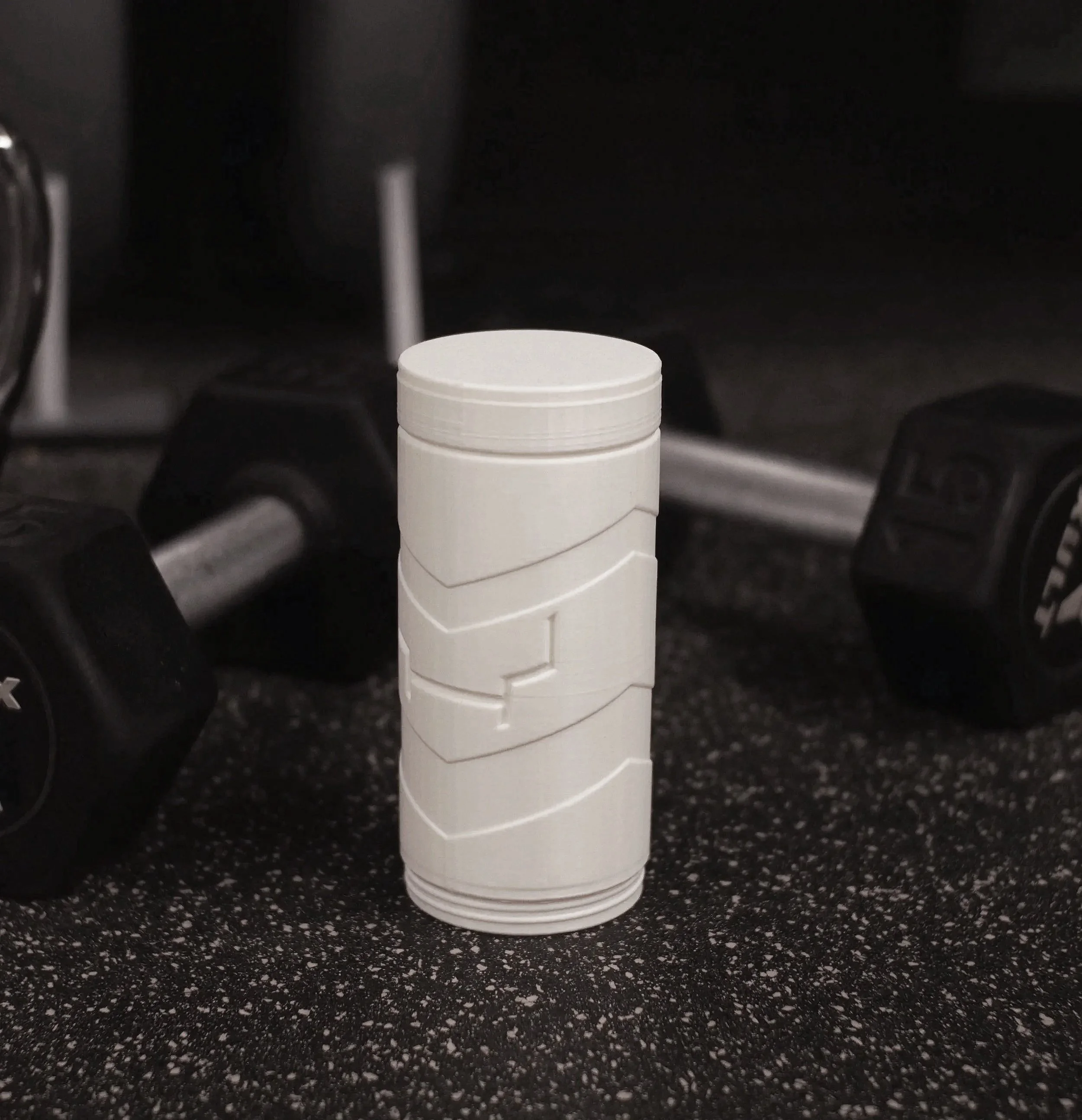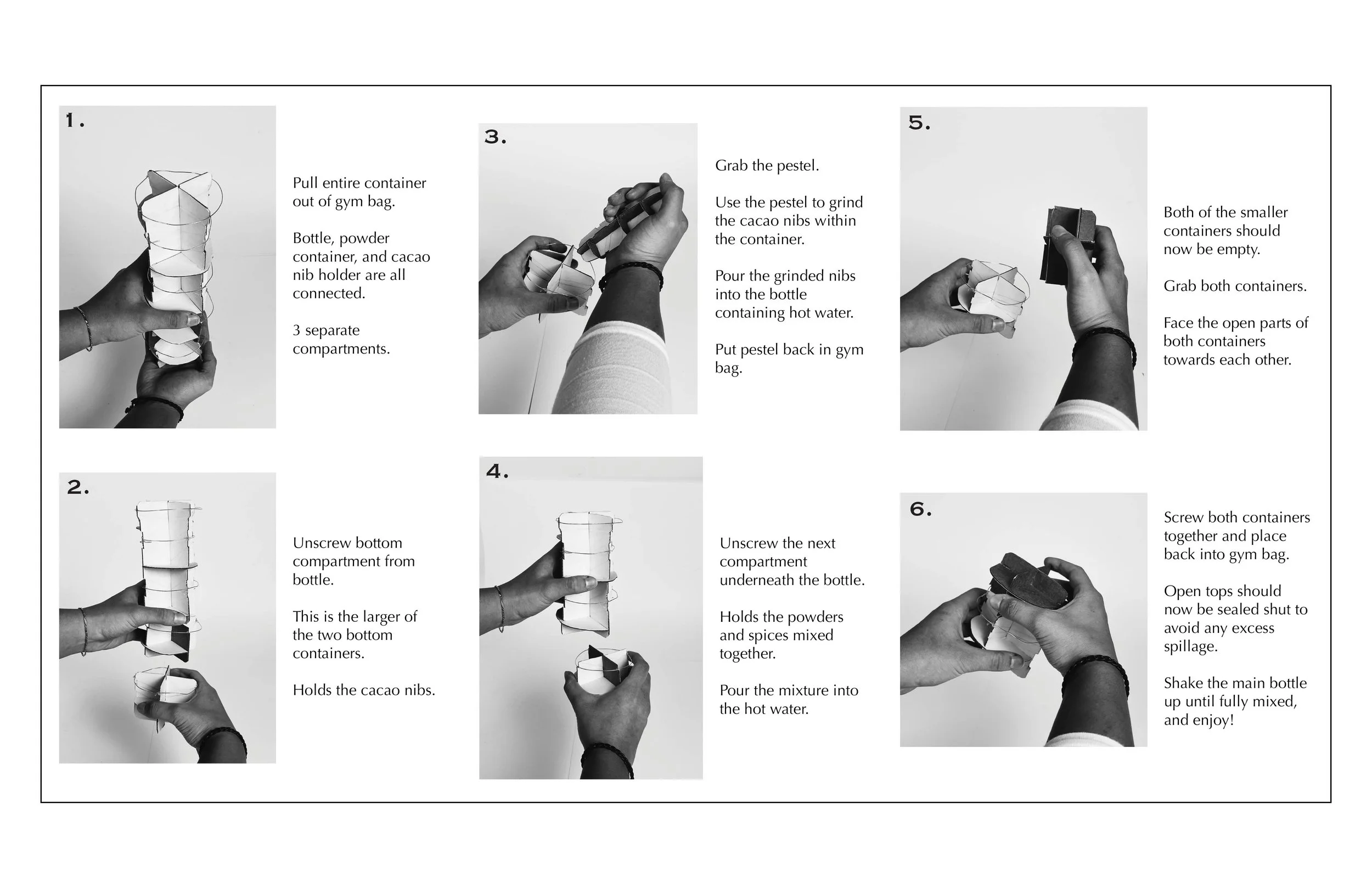 Seperated the powder container in half, leaving one half to hold the grinder and the other half for the powders. Once the user grinds up the powders and pours it into the main vessel, the grinder can screw back into the side with the remnants of the powder. The user can store those two components back in their gym bag, and only use the main vessel for the rest of their workout.