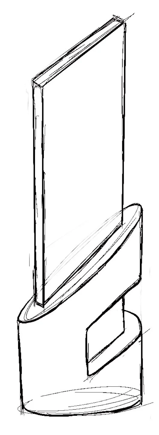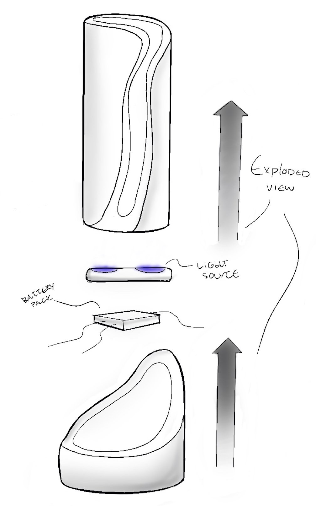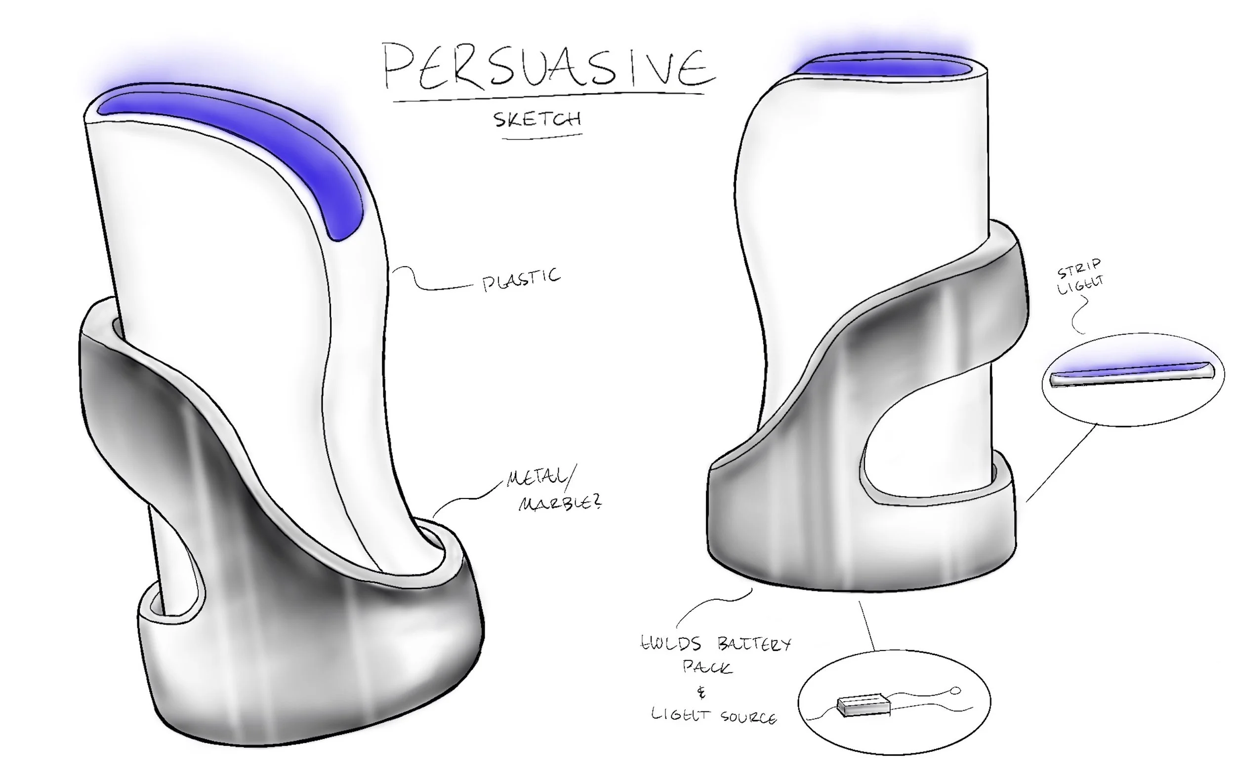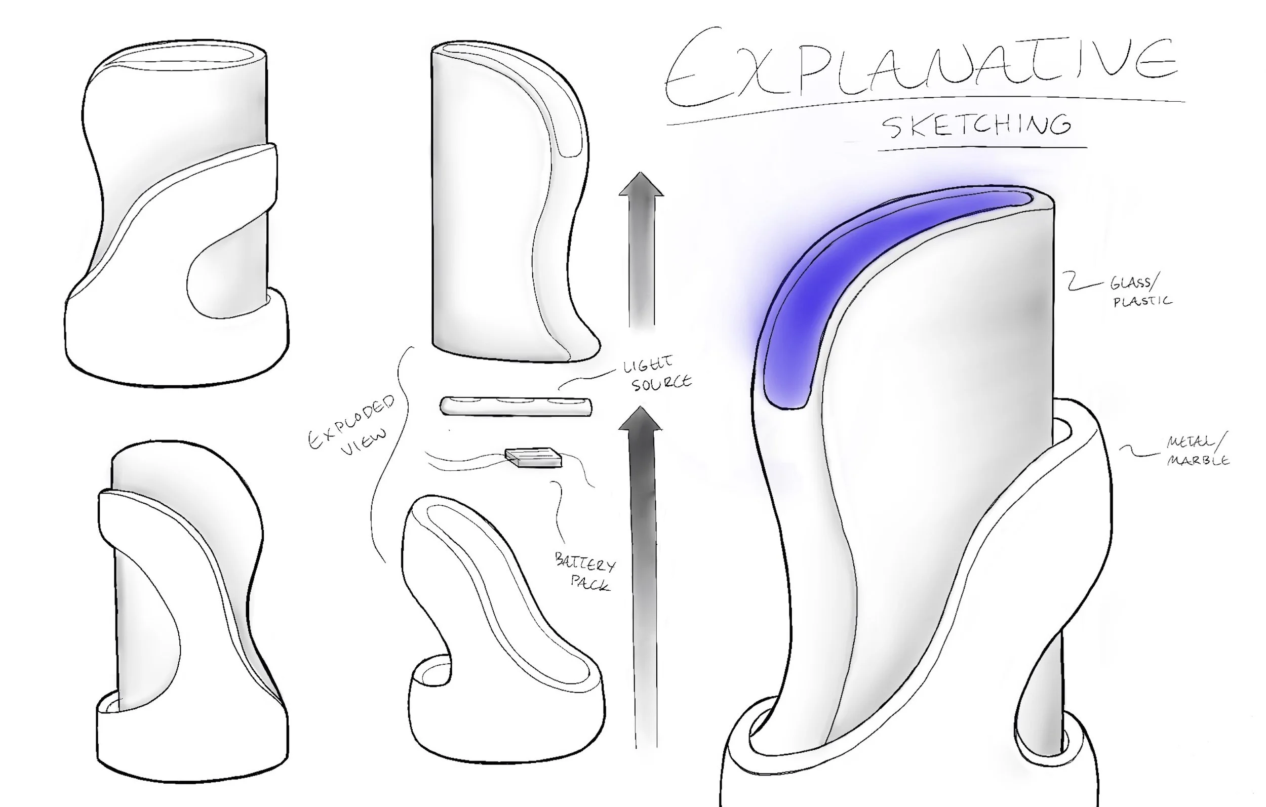 Initial 2D studies & concepts. Consideration of materiality began with metals, plastics, and acrylic. Light source is stored in the base.