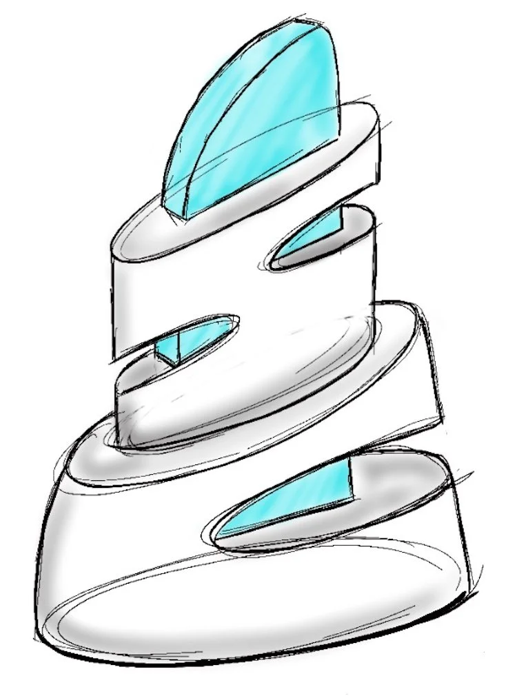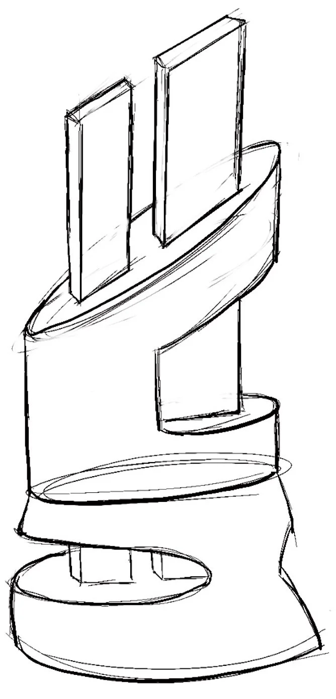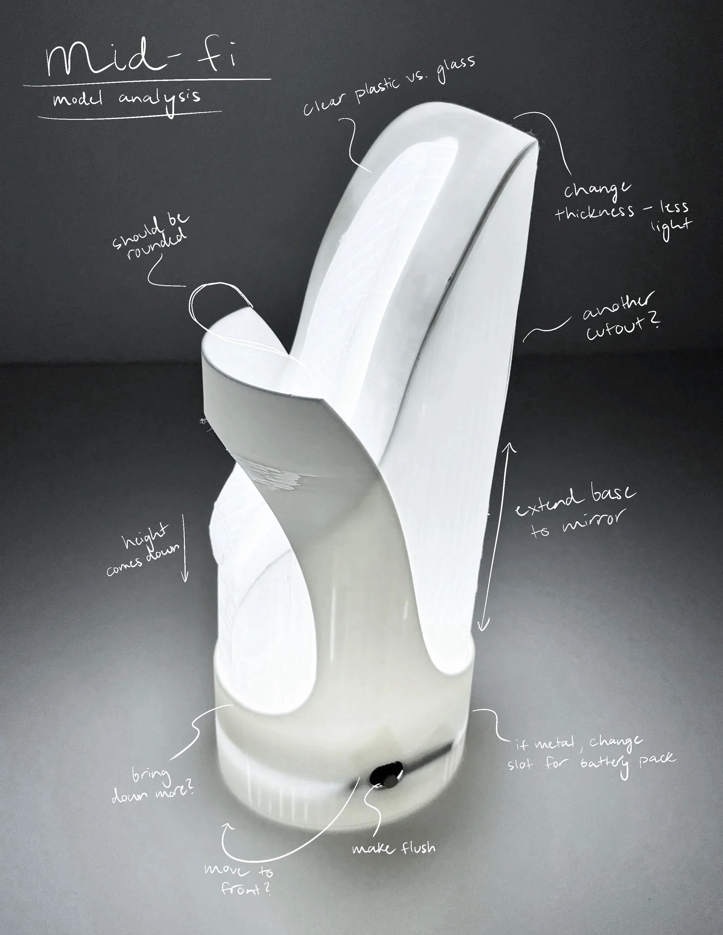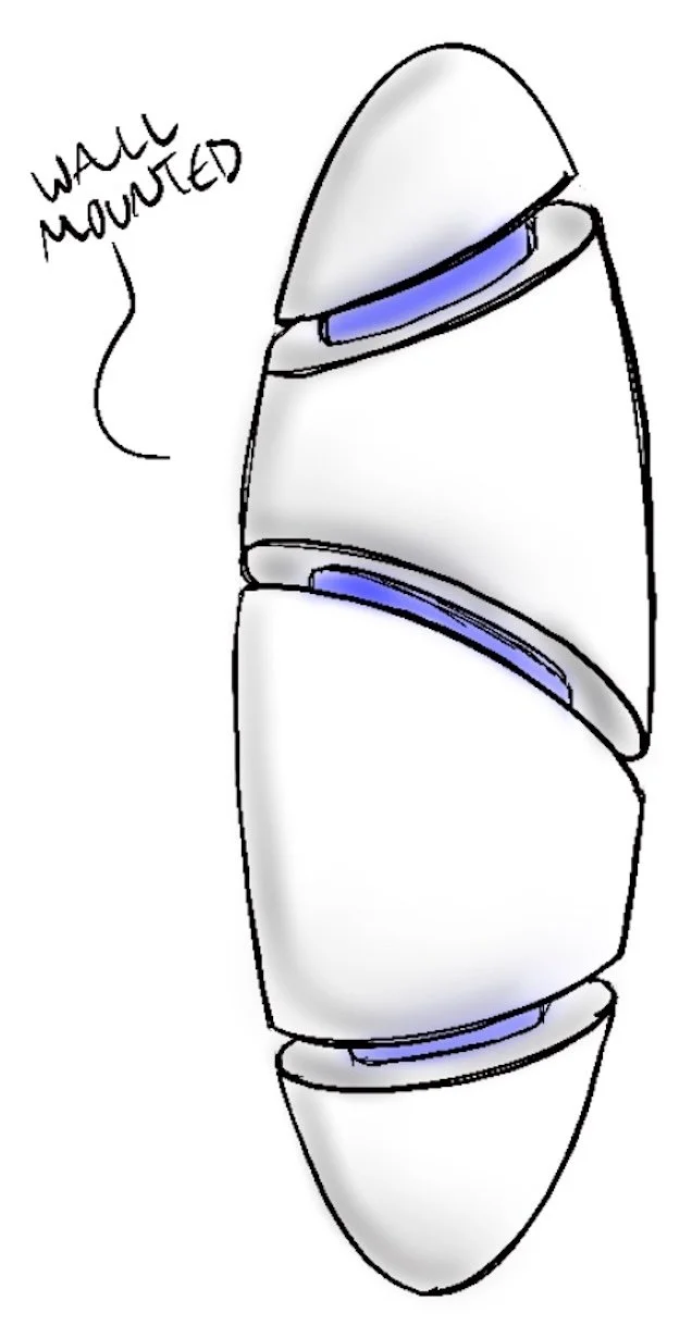 Initial 2D studies & concepts. Consideration of materiality began with metals, plastics, and acrylic. Light source is stored in the base.