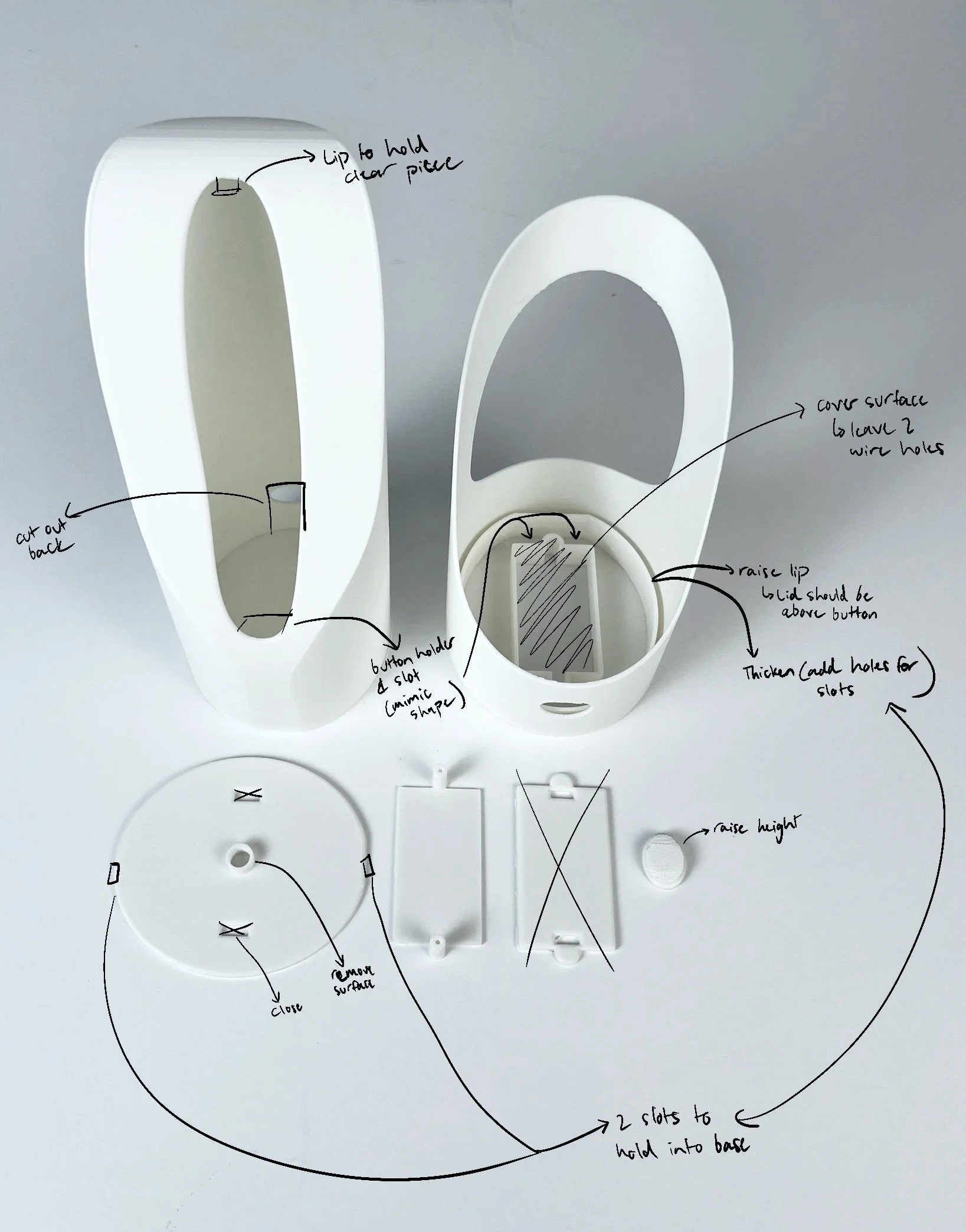 Finalized all pieces & prepared for 3D printed assembly. Main adjustments included the button holder and button gap on the back of the shell.
